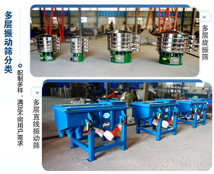 多層振動(dòng)篩可對(duì)粉狀、顆粒狀物料的篩選和分級(jí),廣泛用在塑料、磨料、化工、醫(yī)藥、建材、糧食、炭素、化肥等行業(yè).