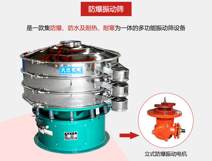 防爆振動篩是針對一些易產生爆炸行業(yè)的研發(fā)設計而成,是一款集防爆、防水及耐熱、耐寒特殊要求的場合為一體的多功能振動篩設備,能夠實現(xiàn)該功能主要原因是防爆振動篩采用的是立式防爆振動電機。