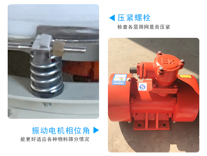 ⑶開機(jī)前,應(yīng)先檢查各壓緊螺栓的緊固程度,及各料口的位置是否與接料器對(duì)正,并觀察振動(dòng)電機(jī)是否能正常轉(zhuǎn)動(dòng)及彈簧受力有無(wú)阻礙,檢查各層篩網(wǎng)是否壓緊。